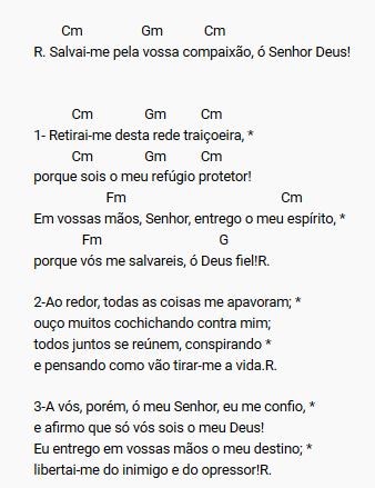 Salmo 17 - 6ª feira da 5ª Semana da QuaresmaAo Senhor eu invoquei na minha angústia e ele escutou a minha voz. Eu vos amo, ó Senhor! Sois minha força, minha r...02.04.2020 | 1 minutos de leitura